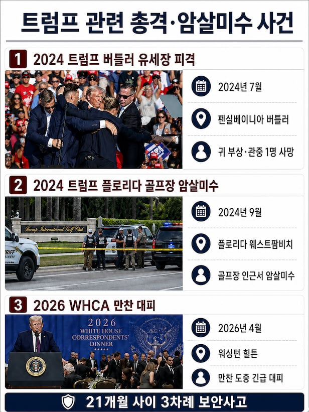 트럼프, 21개월 사이 3차례 피격 위기… 유세장·골프장 이어 만찬장까지 뚫려