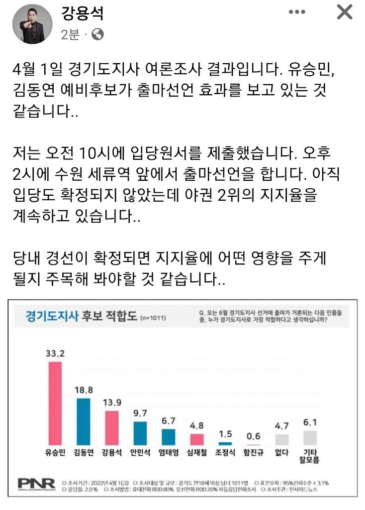 강용석과 김세의는 우파 진영에서도 호불호가 많이 갈린다. 강용석이 사는 곳은 서울이지 경기도가 아니다. 경기도민도 아니면서 경기도지사에 도전한다는 것 자체가 민심 위반이다.
