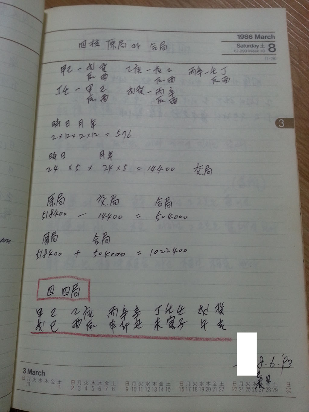 지금으로부터 25년 전 다이어리에 적어 놓았던 합사주 개수 계산법이다. 저 당시에는 계산만 해놓고 실제 개수가 맞는지 518,400 가지 사주를 다 체크해보진 않았는데 올해 5월에 체크한 거랑 비교해보니 정확하다.